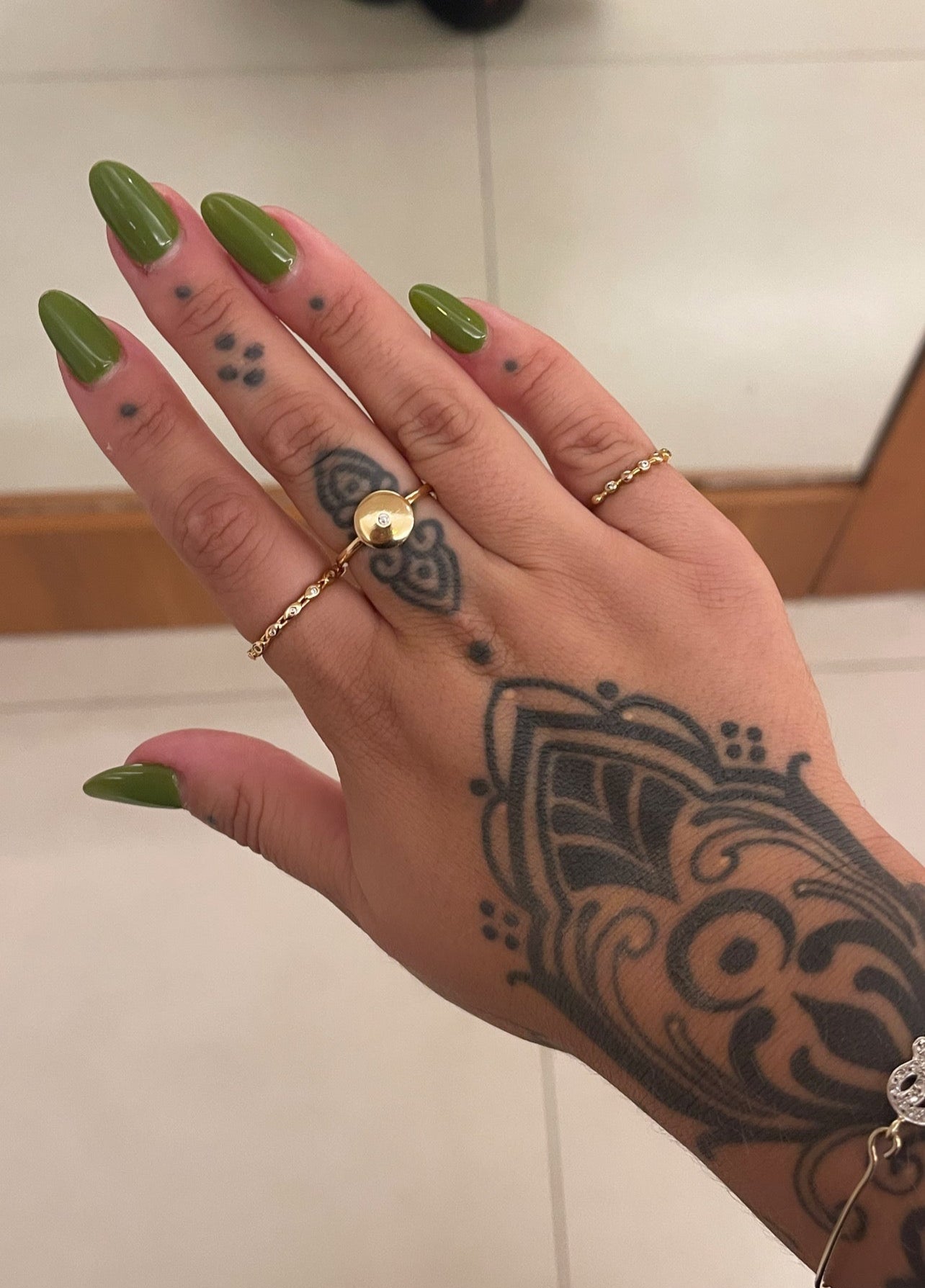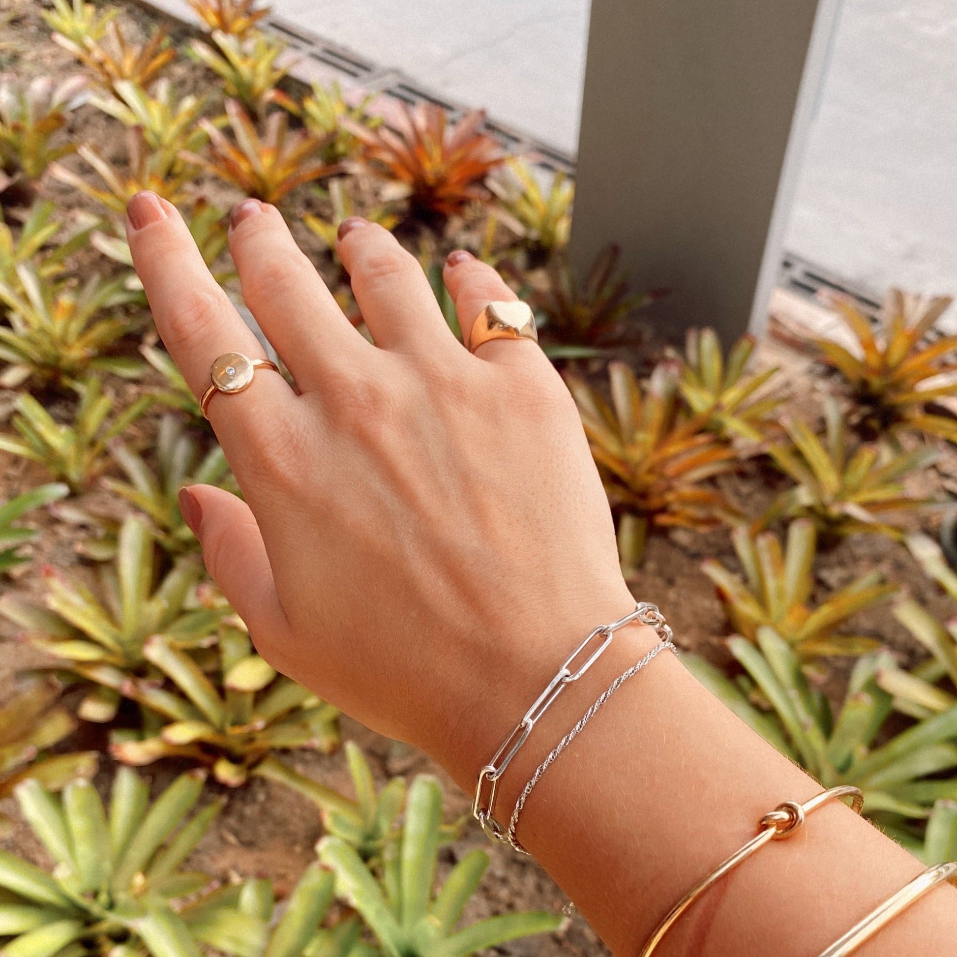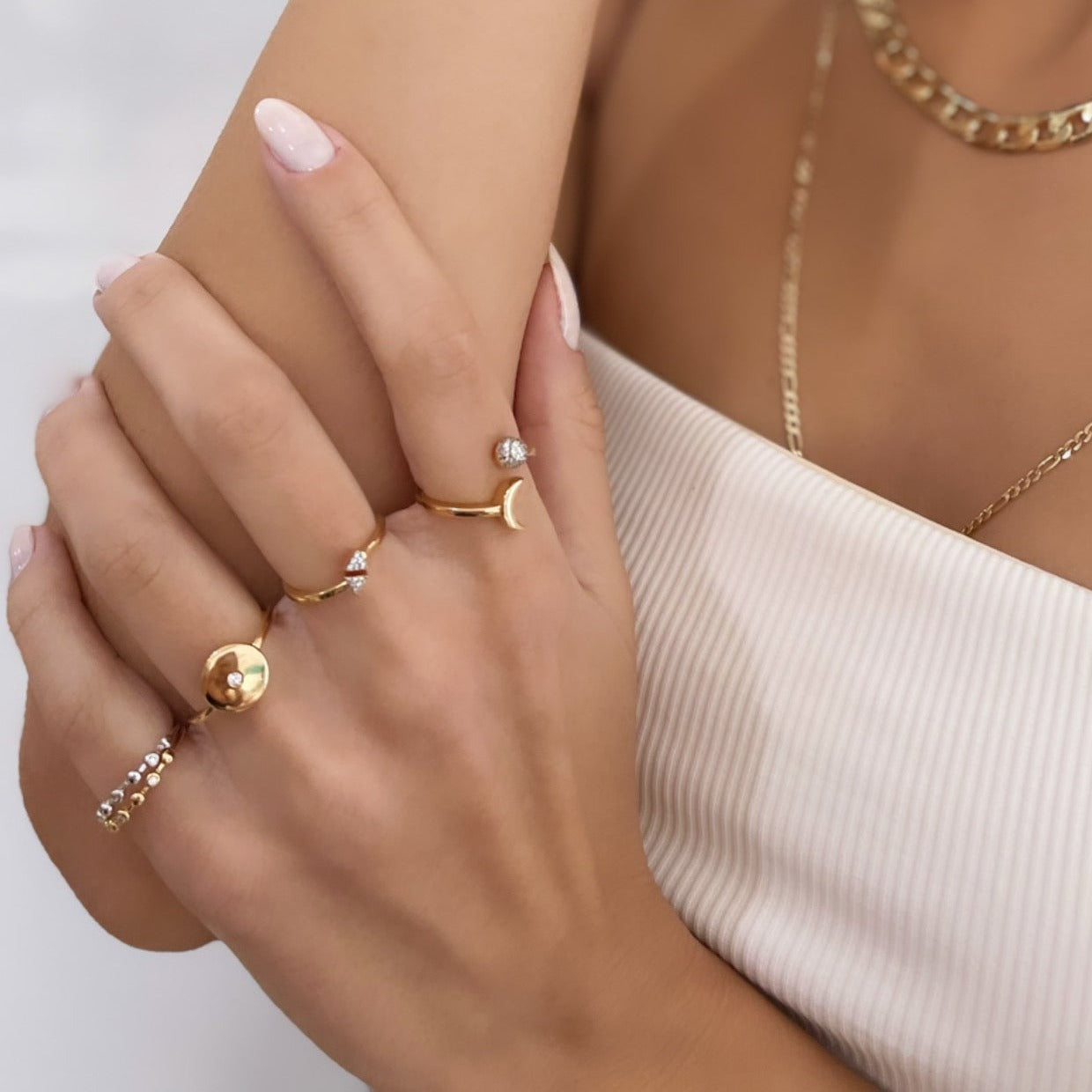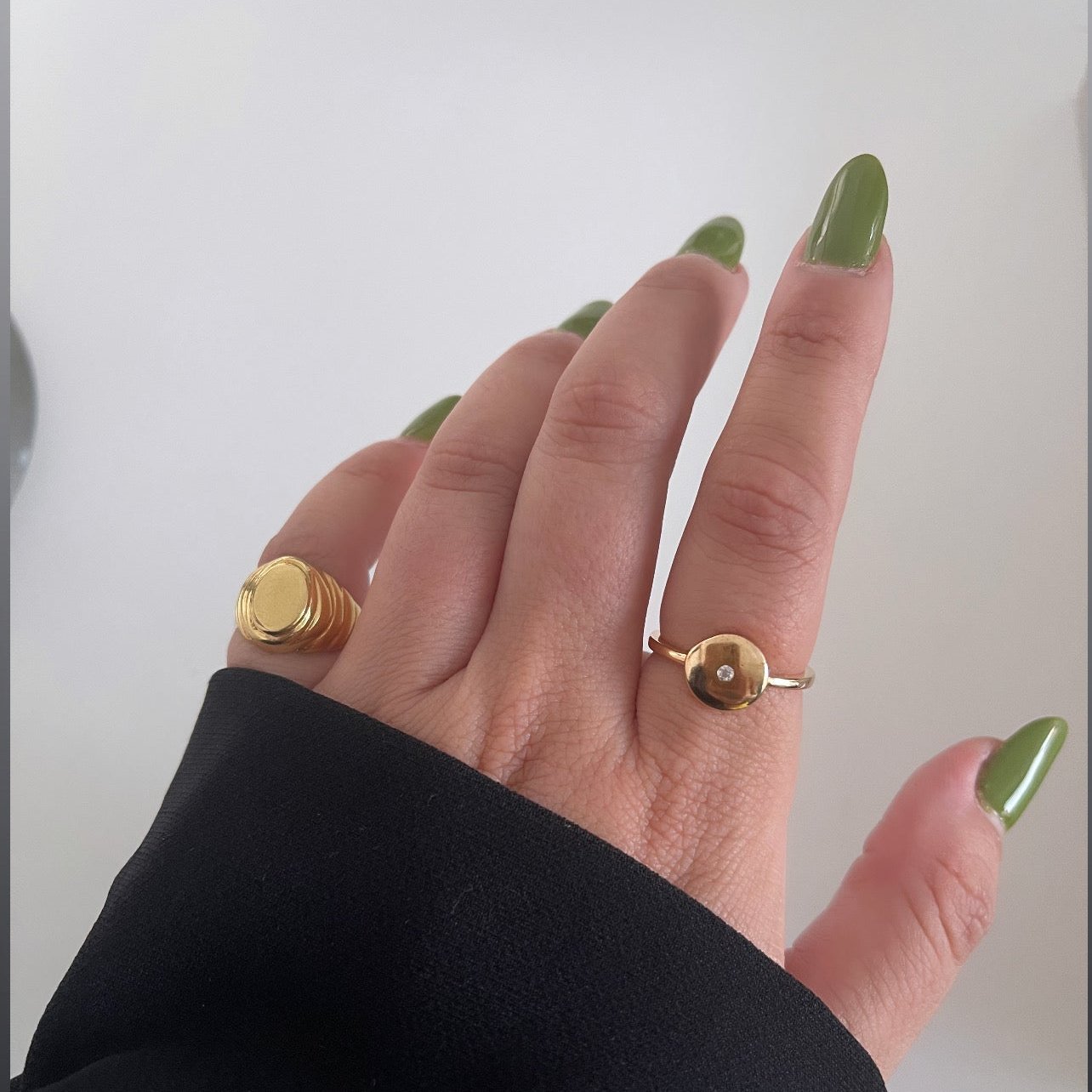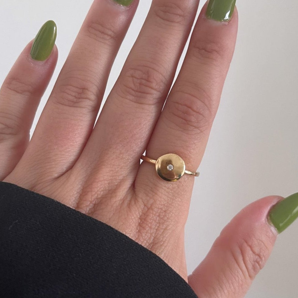 Anel de aro fechado com detalhe ponto de luz com zircônia. Semijoia: banho 10 milésimos de ouro18k com dupla camada de Verniz. Metal Nobre