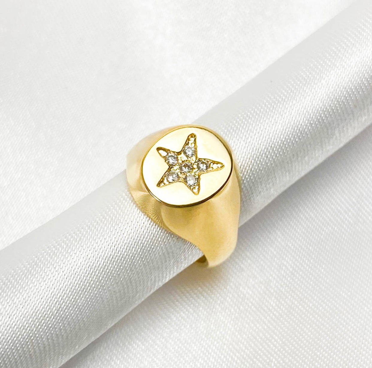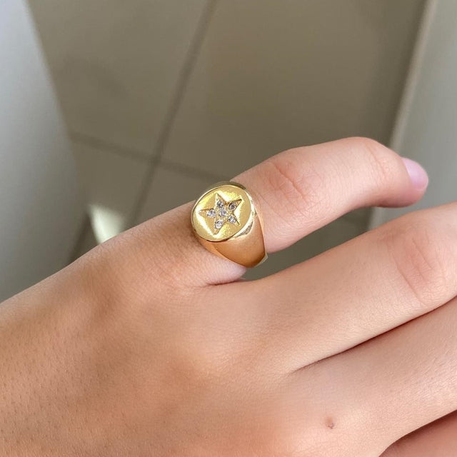 Anel regulável de mindinho com detalhe de zircônias cravadas à mão. Semijoia banhada com total de 10 milésimos de ouro e dupla camada de Verniz Italiano (verniz de alta joalheria).