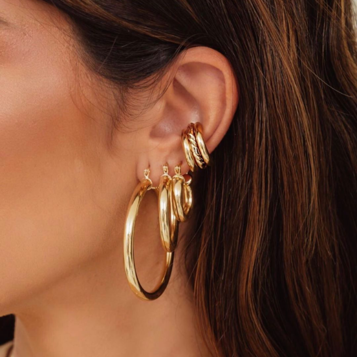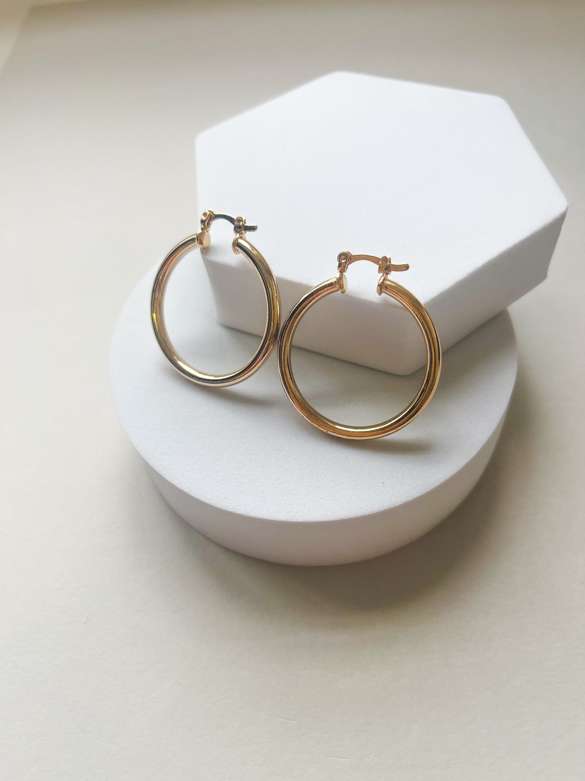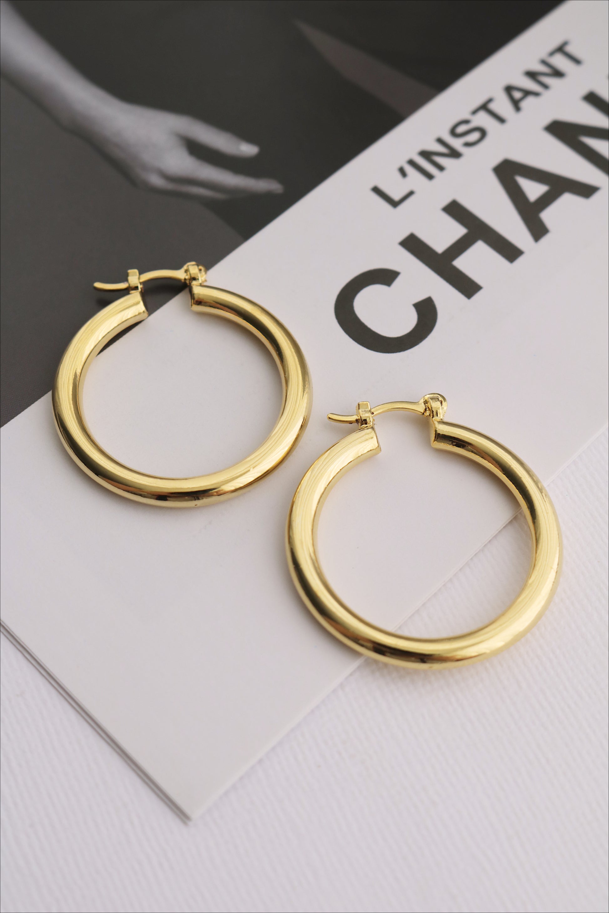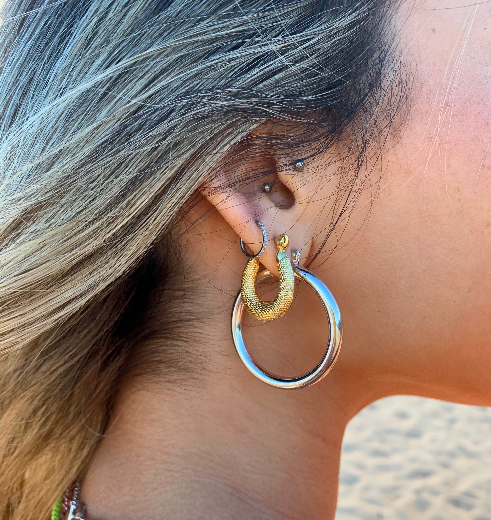 Tamanho médio. Brinco no formato de argola fechada com fecho em Click italiano (abre e fecha).