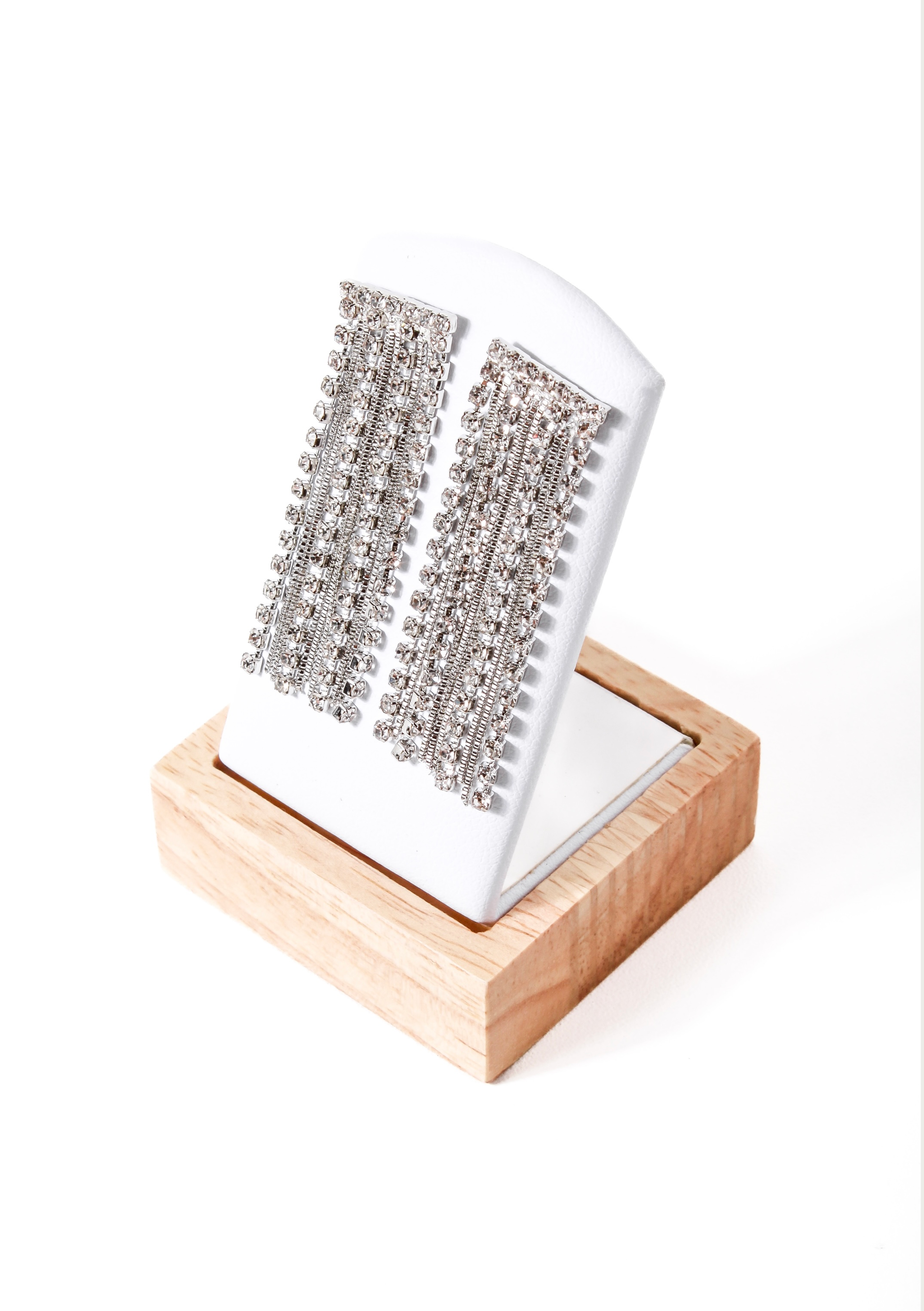 Brinco de pino com fecho de Tarraxas. Vem com detalhes de correntinhas com fios de pedras cristais. Possui tamanho mediano de 6 centímetros de comprimento.