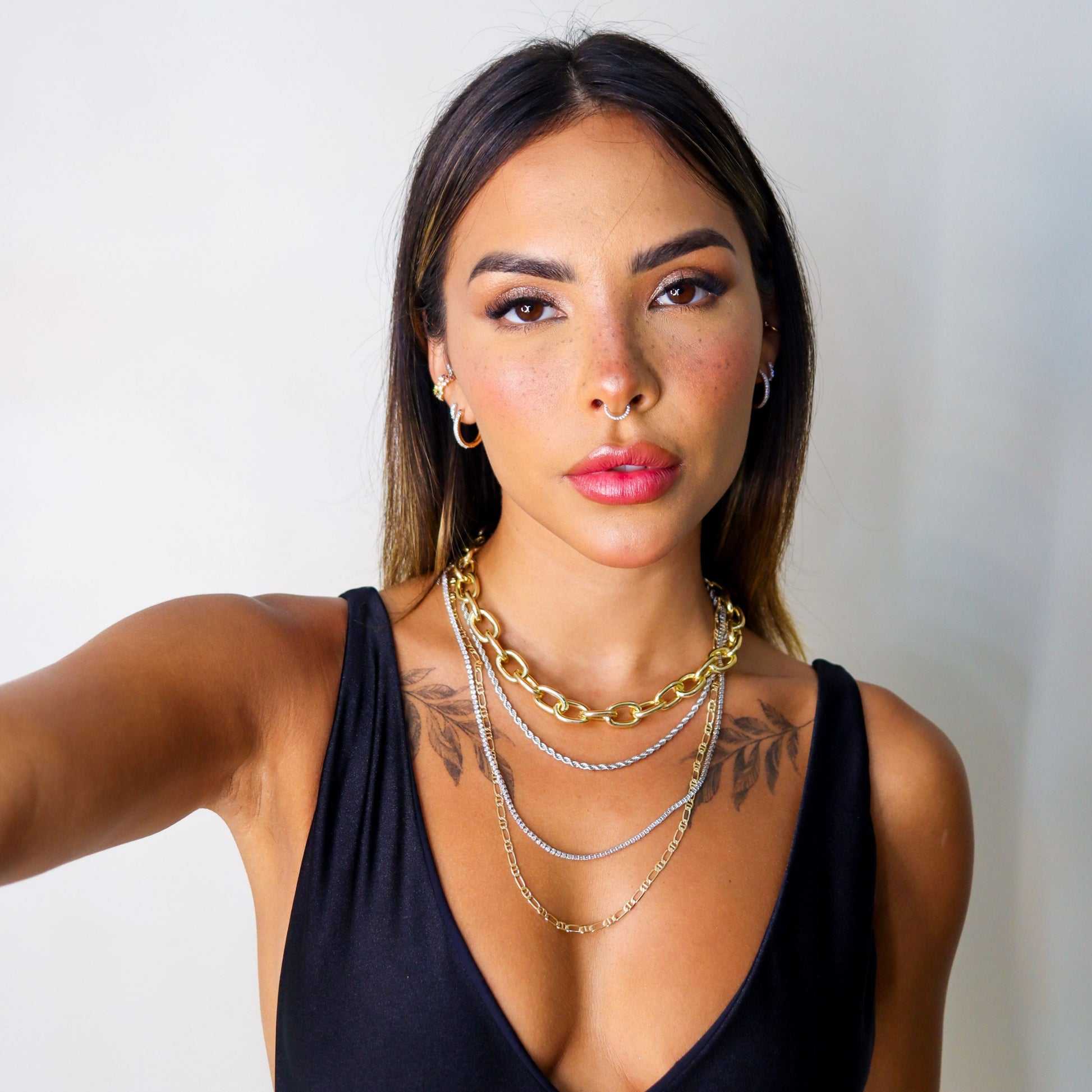 Uma peça coringa & super Trend. É Ousadia e Style puro. Colar no estilo deles em Correntaria e pode ser usado como Choker também. Semijoia banhada com total de 10 milésimos de ouro e dupla camada de Verniz Italiano (o melhor verniz de alta joalheria).